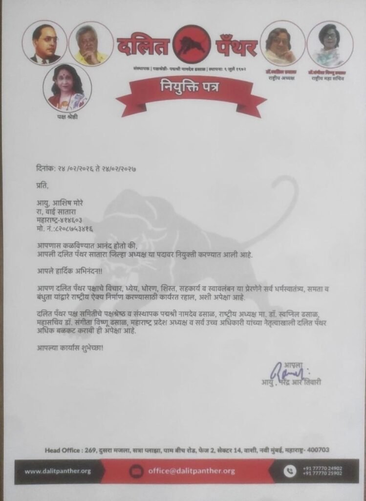 सातारा : सामाजिक न्याय, समता आणि बंधुता या तत्त्वांवर कार्यरत असलेल्या दलित पँथर पक्षाच्या सातारा जिल्हाध्यक्षपदी आशिष मोरे (रा. वाई , जि. सातारा) यांची नियुक्ती करण्यात आली आहे .