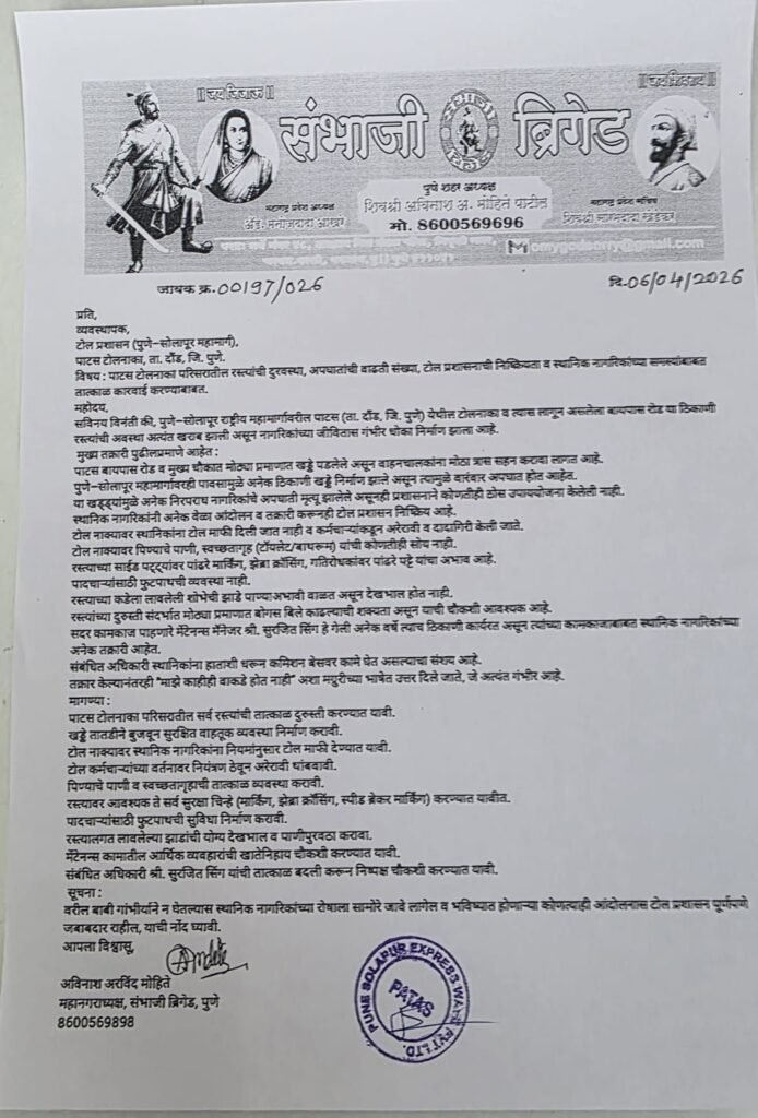 पाटस (ता. दौंड, जि. पुणे) येथील टोलनाका परिसरात रस्त्यांची अत्यंत दयनीय अवस्था निर्माण झाली असून मोठ्या प्रमाणात खड्डे पडलेले आहेत. या खड्ड्यांमुळे वारंवार अपघात होत असून अनेक निष्पाप नागरिकांना आपला जीव गमवावा लागला आहे. तरीही टोल प्रशासन याकडे जाणीवपूर्वक दुर्लक्ष करत असल्याचा आरोप संभाजी ब्रिगेडने केला आहे. तात्काळ दुरुस्ती करा जे अधिकारी कामचुकारपणा करत आहेत त्यांच्यावरती निलंबनाची कारवाई करा अशी मागणी करणारे निवेदन प्रवीण कांबळे