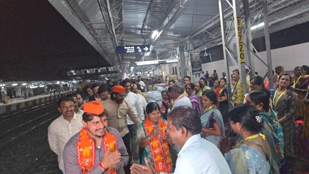 स्टेशन परिसर पहाटेपासूनच भाविकांच्या गर्दीने फुलून गेला होता. भगवा झेंडे, टाळमृदंगाचा नाद, “हर हर महादेव” आणि “जय श्रीराम” च्या जयघोषात संपूर्ण परिसर दुमदुमून गेला. भक्तांच्या चेहऱ्यावरची आनंद–भावनिक चमक वातावरणाला अधिक पवित्र करत होती.