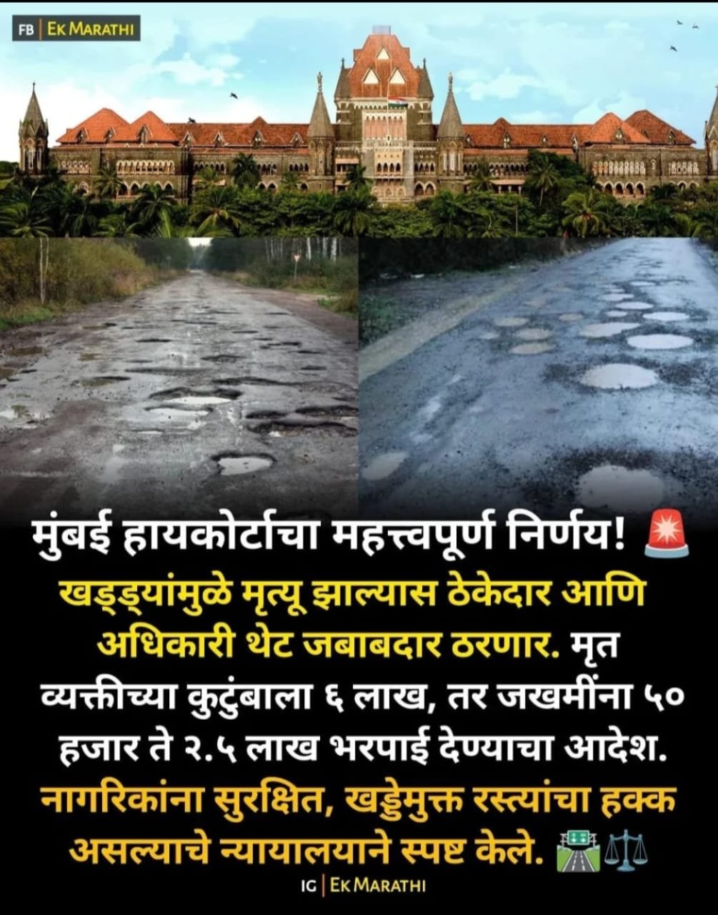 मुंबई — राज्यातील रस्त्यांवरील खड्ड्यांमुळे होणाऱ्या अपघातांच्या आणि जीवित हानीच्या घटनांकडे गांभीर्याने पाहत मुंबई उच्च न्यायालयाने आज एक ऐतिहासिक निर्णय दिला आहे. या निर्णयानुसार, रस्त्यावरील खड्ड्यांमुळे एखाद्या व्यक्तीचा मृत्यू झाल्यास संबंधित ठेकेदार आणि शासन अधिकारी यांना थेट जबाबदार धरले जाईल.
