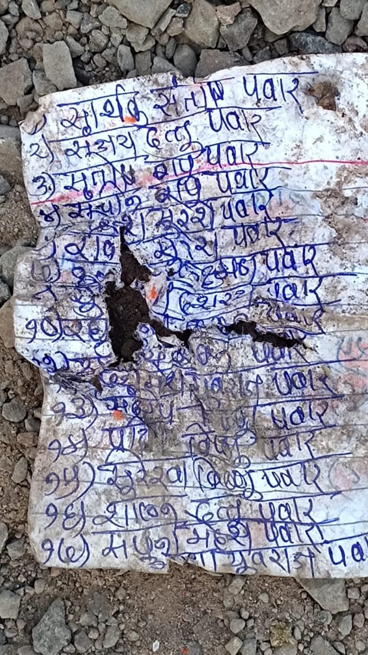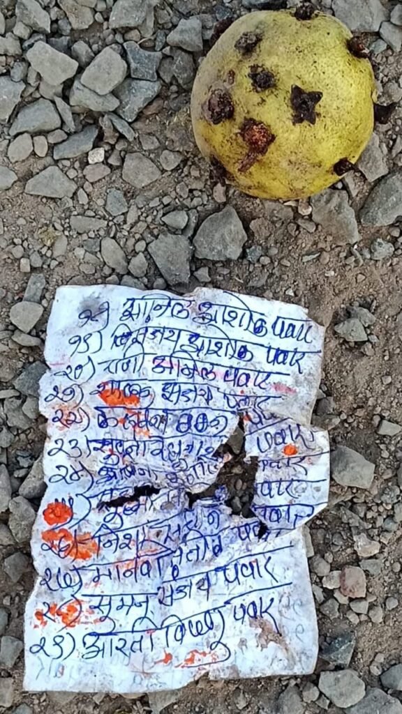 पंचशीलनगर येथील जुन्या दौंड रोडलगत रविवारी (दि. ३०) सकाळी हे सर्व साहित्य आढळून आले. वहीच्या पानावर पवार कुटुंबातील २९ जणांची पूर्ण नावे लिहिली आहेत. त्यात महिलांसह लहान मुलांच्या नावांचाही समावेश आहे. त्यावर हळद-कुंकू टाकून त्याशेजारी लिंबू होते. त्या लिंबूला लवंग व टाचण्या टोचून त्यालाही हळद-कुंकू लावले होते. हा प्रकार दिसताच परिसरातील महिला व ग्रामस्थ घटनास्थळी जमा झाले. त्यांनी या प्रकाराबाबत पोलिसांना माहिती दिली. या अघोरी प्रकाराची माहिती मिळताच पोलिसांनी घटनास्थळी धाव घेत चिठ्ठी व