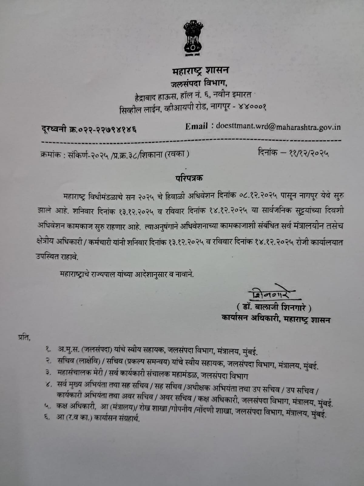 त्याचे झाले असे की, महाराष्ट्र विधिमंडळाचे सन २०२५ चे हिवाळी अधिवेशन दि. ८ डिसेंबर पासून नागपूर येथे सुरू झाले आहे. शनिवार (दि. १३) व रविवार (दि. १४) या सार्वजनिक सुट्टयांच्या दिवशी अधिवेशन कामकाज सुरू राहणार आहे. त्या अनुषंगाने कामकाजाशी संबंधित सर्व अधिकारी व कर्मचारी यांनीशनिवारी व रविवारी कार्यालयात उपस्थित राहावे असे परिपत्रक महाराष्ट्राचे राज्यपाल यांच्या आदेशानुसार व नावाने काढण्यात आले होते. हे परिपत्रक सर्व शासकीय कार्यालयांना प्राप्त झालेले आहे. असे असतानाही केडगाव पाटबंधारे विभागात मात्र या आदेशाचा अवमान झाल्याचे दिसून आले.